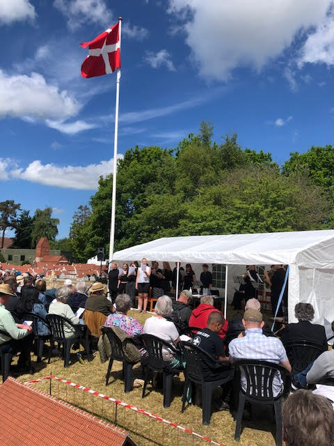 Blå himmel, bagende sol, flaget til tops, skønt vejr for de over 250 deltagere i den traditionelle pinsegudstjeneste i Kjøge Mini-By mandag formiddag.